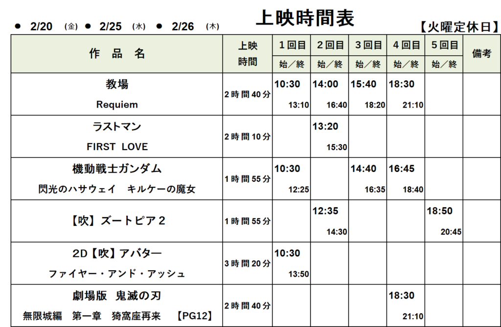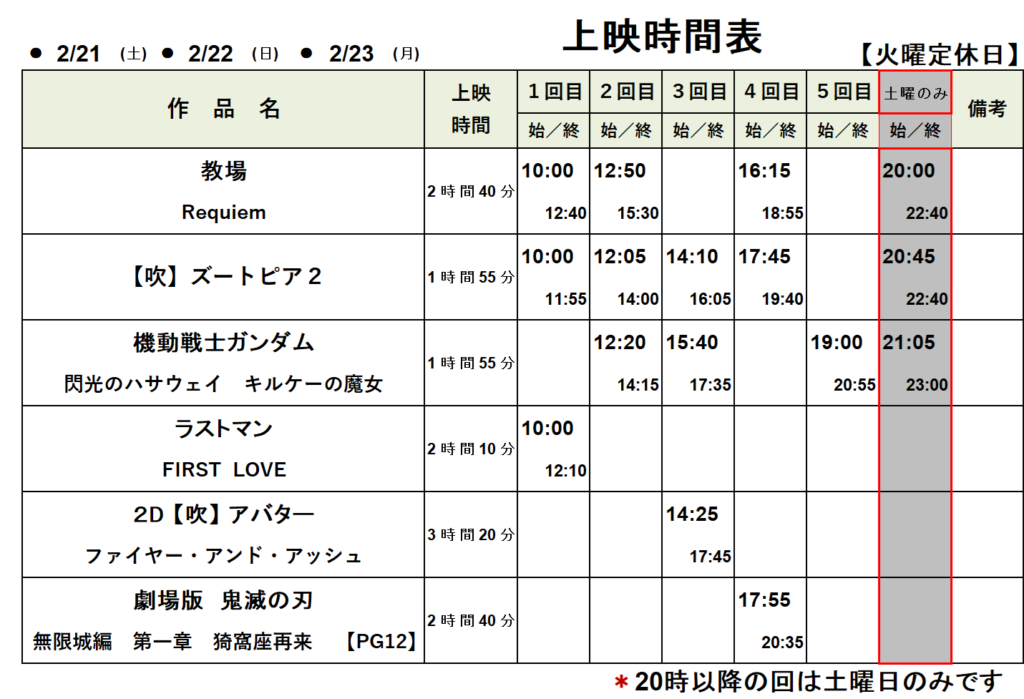 (20時以降の回は土曜日のみです。)